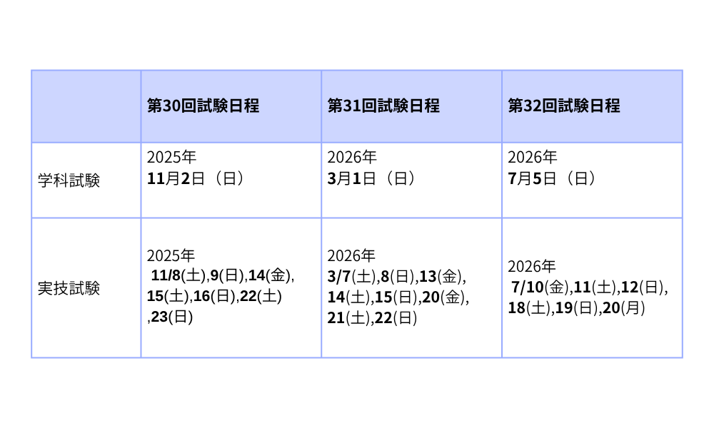 学科試験の日程はいずれも同じですが、実技試験の日程と開催場所が異なります。試験は年3回、概ね3月・7月・11月頃に実施されます。直近の開催日程はこちらです。