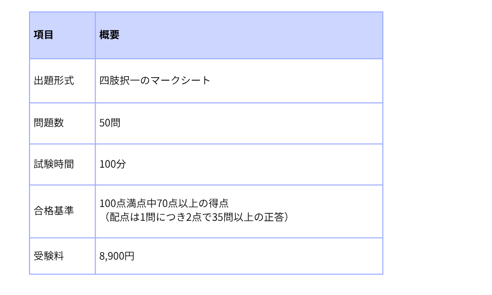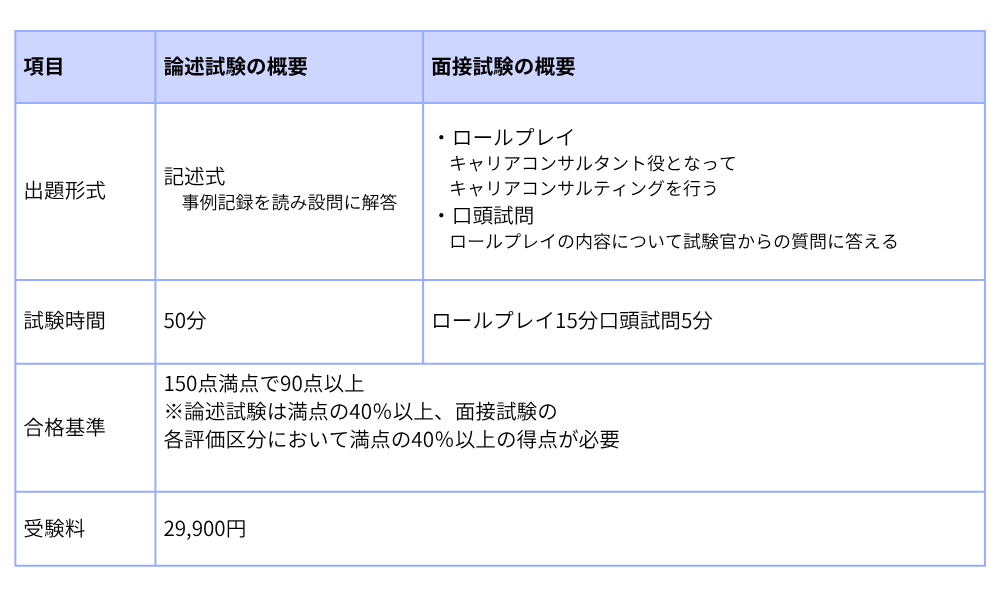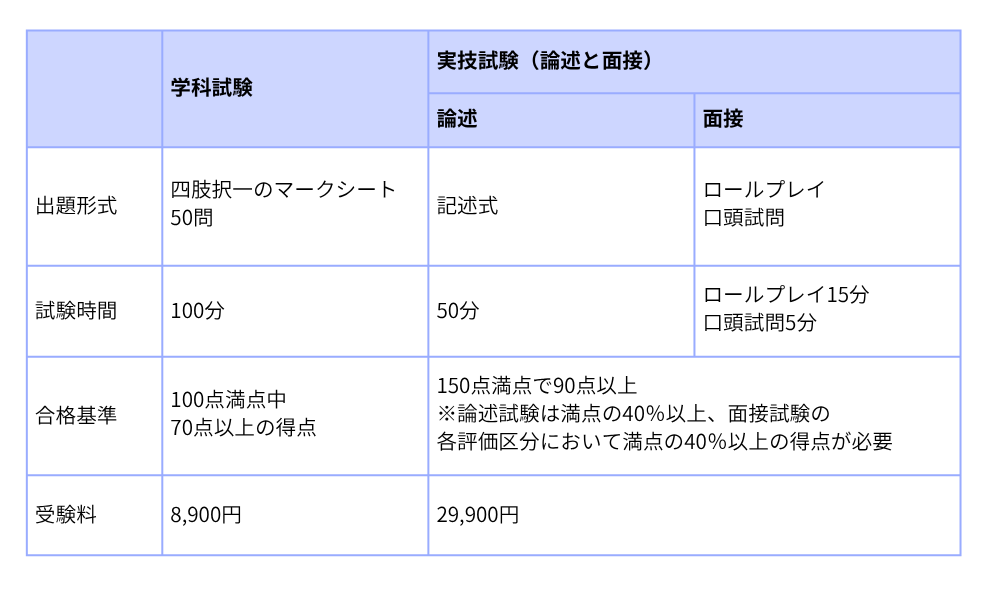 学科試験と実技試験から構成。学科の合格基準は100点満点中70点以上。実技の合格基準は150点満点で90点以上(論述試験は満点の40%以上の得点、かつ面接試験は評価区分ごとに満点の40%以上の得点が必要)
