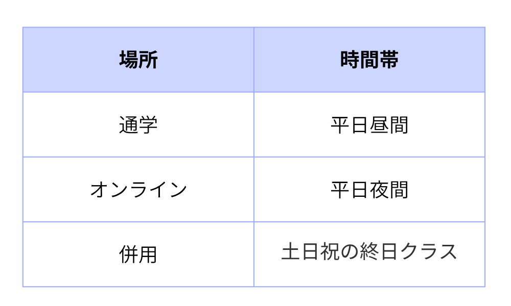 養成講習のスタイルは様々で、ご自身に合った場所や時間帯から選ぶことが出来ます。